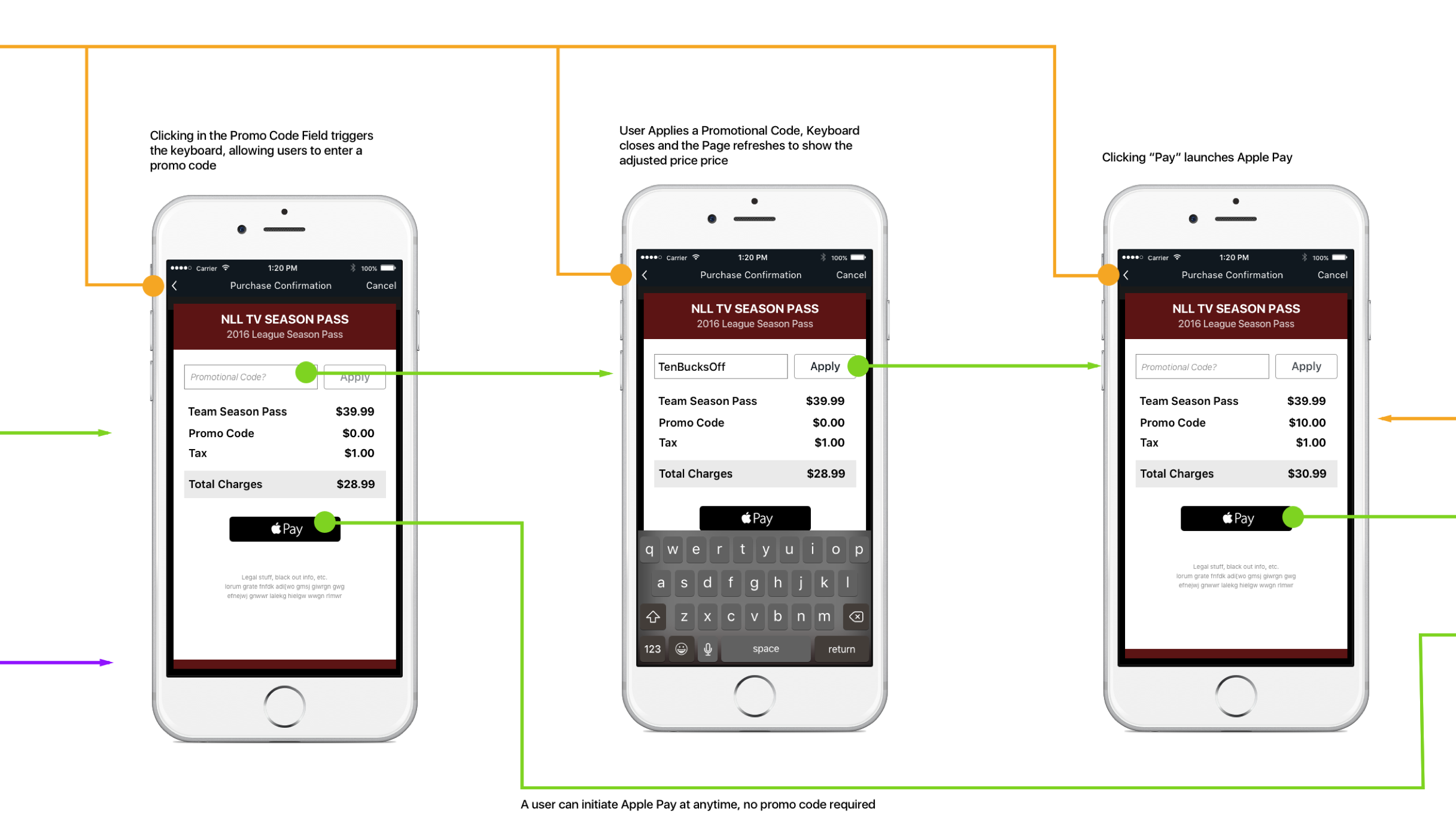 We also needed a simple form that included the ability to add coupon codes and calculate all the related costs and fees. The NLL also requested that we only use Apple Pay as the purchase option (credit cards and paypal was enabled via the web interface). The buttons are dynamic - if a user doesn't enter a promo code, then the button is not clickable.